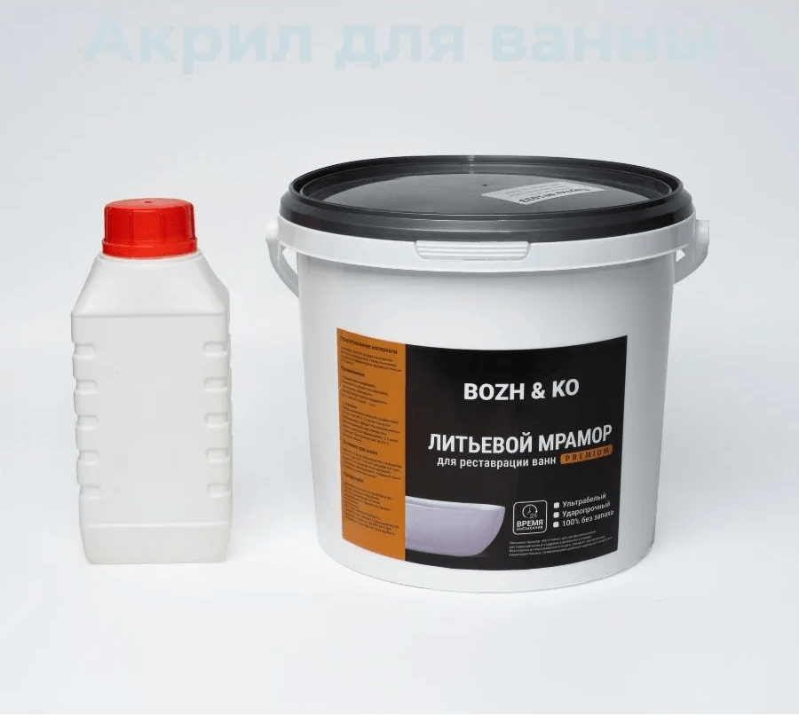 Литьевой мрамор BOZH & KO для реставрации ванн предназначен для реставрации чугунных, металлических и акриловых ванн